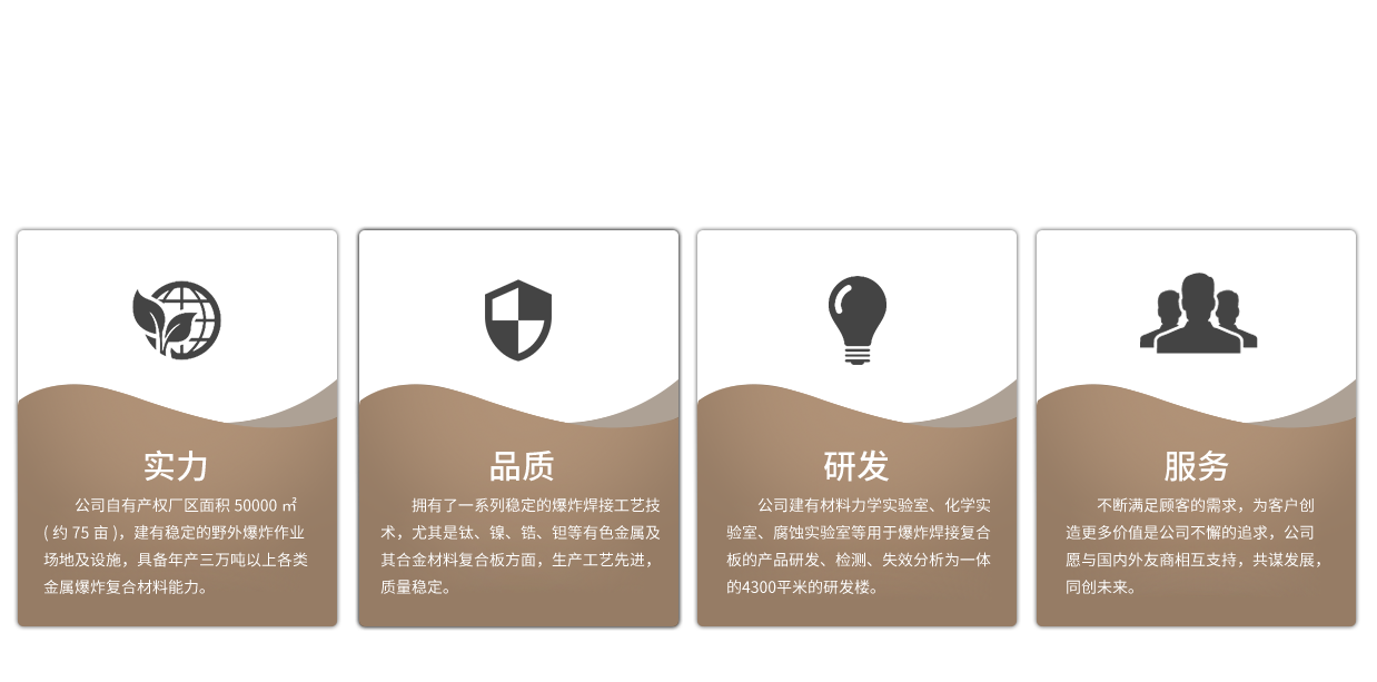 - 安徽弘雷金屬復(fù)合材料科技有限公司成立于2013年5月,坐落于宣紙之鄉(xiāng)—安徽省宣城市,專業(yè)從事各類金屬爆炸復(fù)合材料研發(fā)、生產(chǎn)、銷售和咨詢。注冊資本伍仟萬元,自有產(chǎn)權(quán)廠區(qū)6萬余平方米(約90畝),建有自有產(chǎn)權(quán)的野外爆炸作業(yè)場地及設(shè)施,具備年產(chǎn)四萬噸以上能力。...